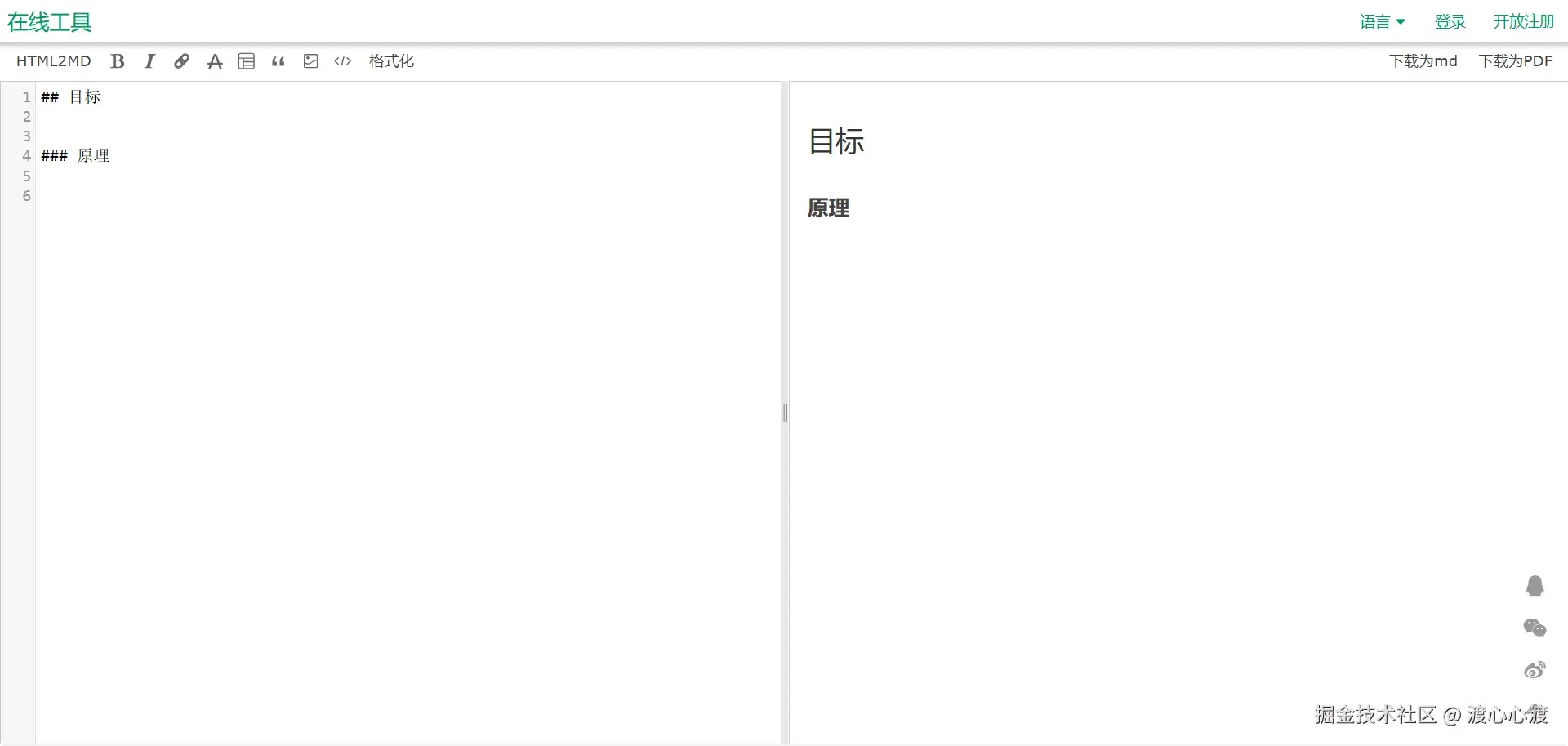 这是一个提供在线Markdown编辑与格式转换的工具网站,支持HTML转Markdown、文本格式化,并能将内容导出为MD或PDF文件。