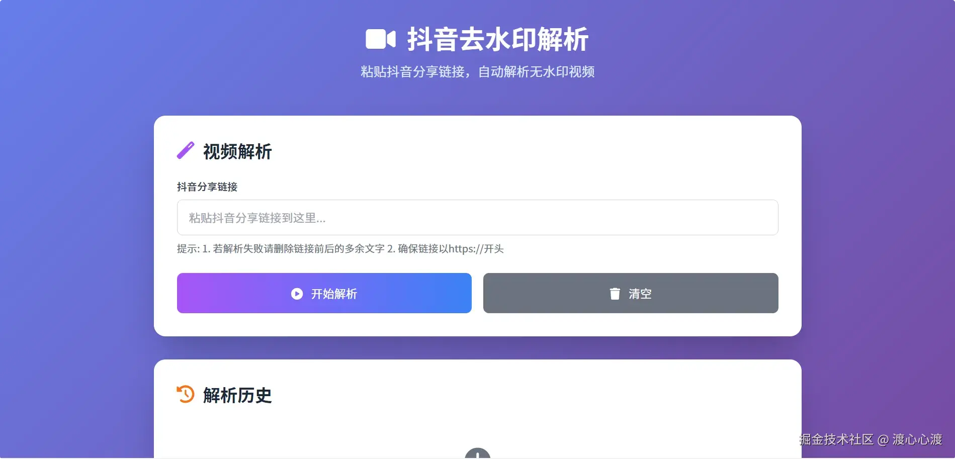 一个去水印解析工具:粘贴分享链接,一键获取无水印视频,支持复制与历史记录,仅供学习交流。
