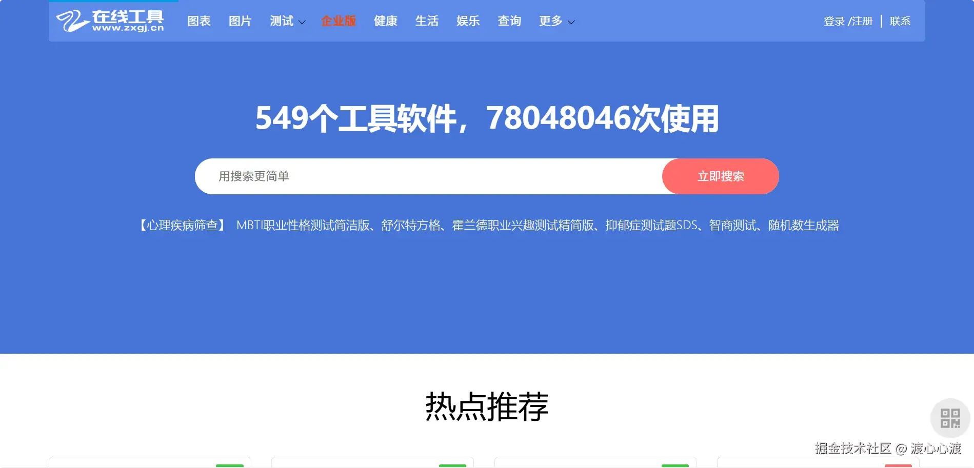 在线工具网(zxgj.cn)是一个汇集了心理测评、职业测试与生活实用工具的综合性平台。它提供从瑞文智力、MBTI性格到双相障碍筛查等专业心理评估,以及霍兰德职业兴趣、人格障碍筛查等职业发展工具,同时还包含快递查询、利息计算等便捷的免费生活服务,是一个工作与生活中的得力助手。