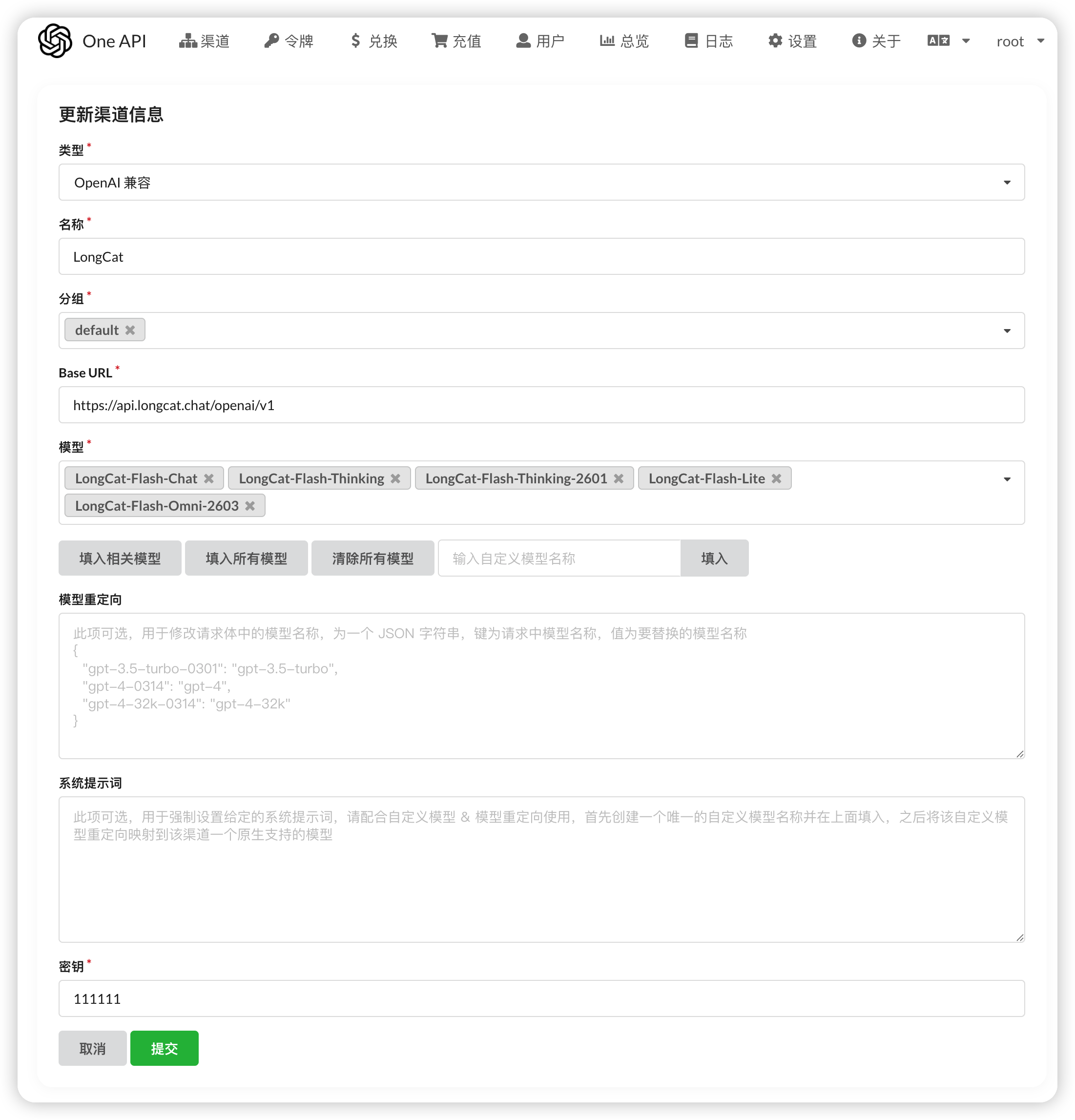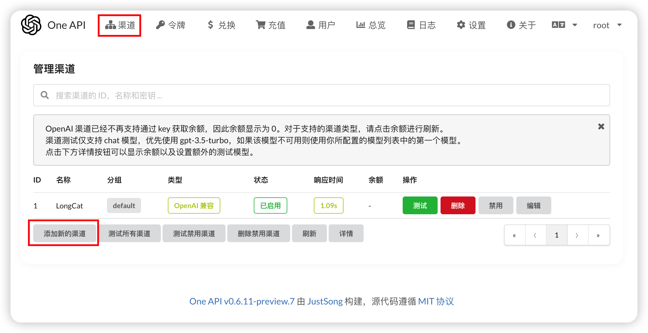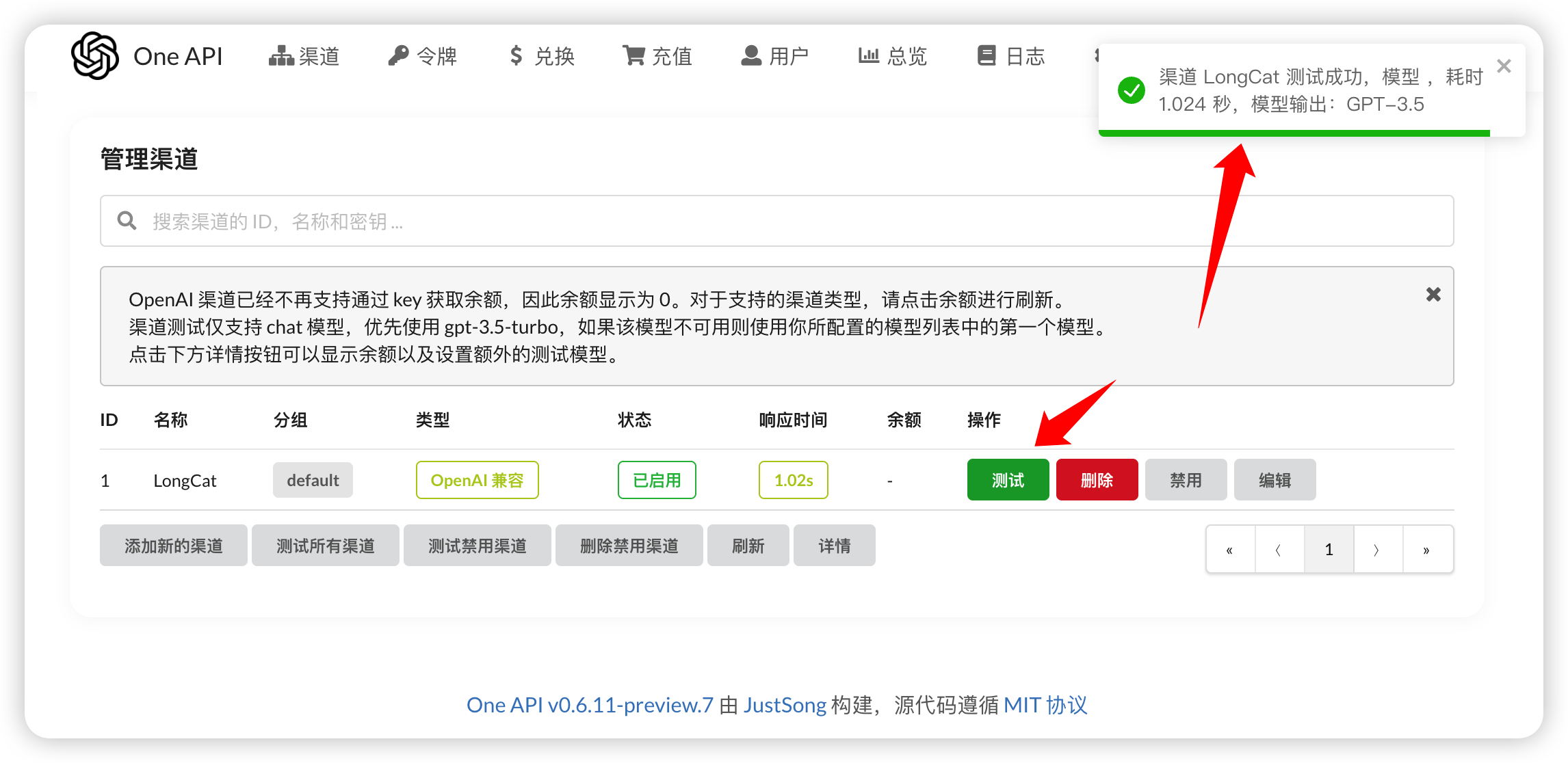 保存后回到渠道列表,点击“测试”。若右上角显示成功提示,说明 One API 已经成功“握手” LongCat。