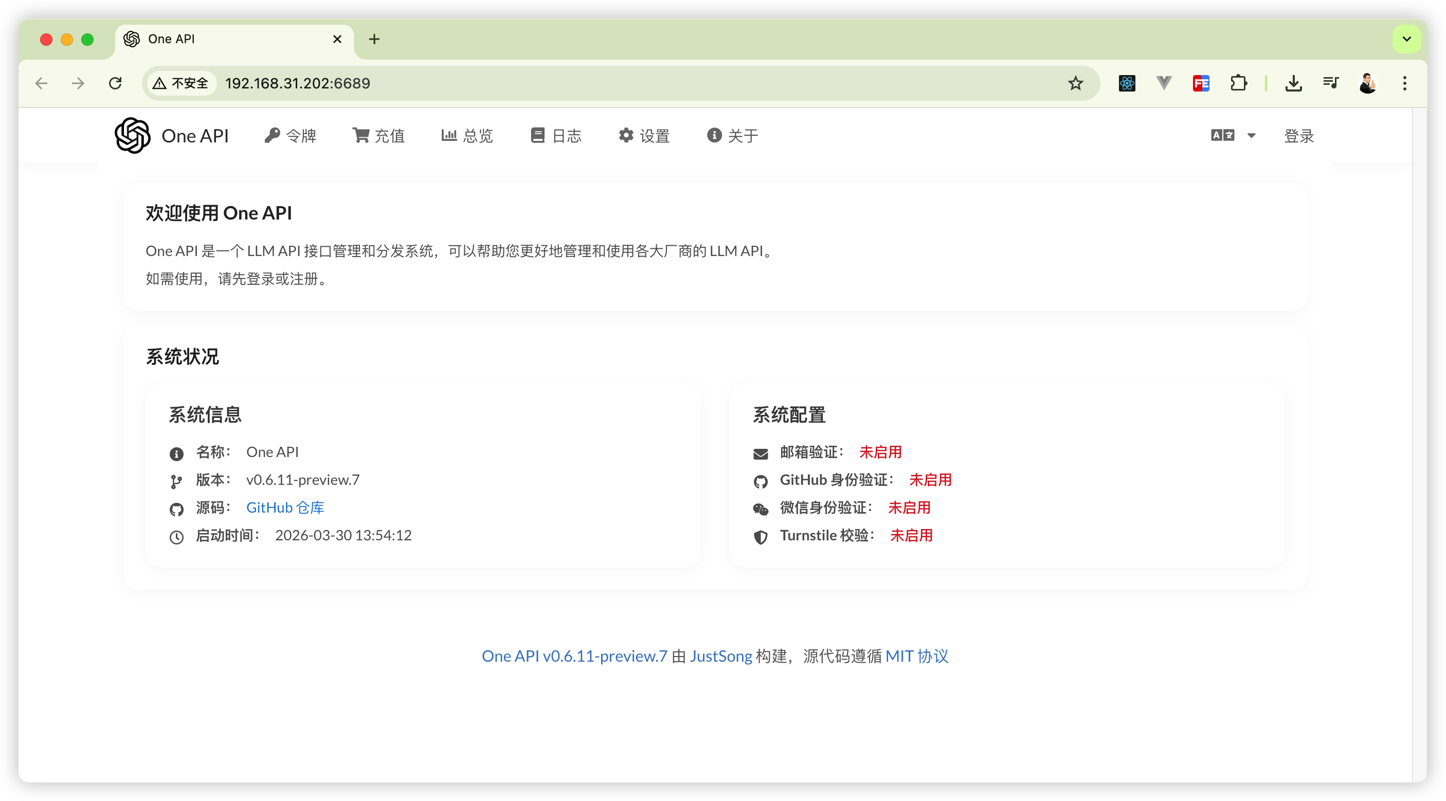 项目构建成功后,在浏览器访问 NAS_IP:6689 即可打开 One API