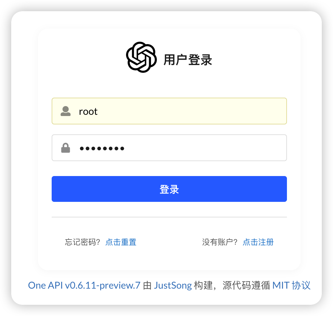 打开 One API 后第一步点击右上角的“登录”按钮,账号是 root,密码是 123456