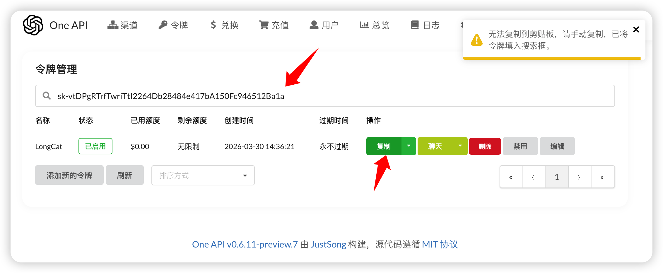 令牌创建后,点击“复制”按钮,你将获得一个以 sk- 开头的密钥,手动复制它。