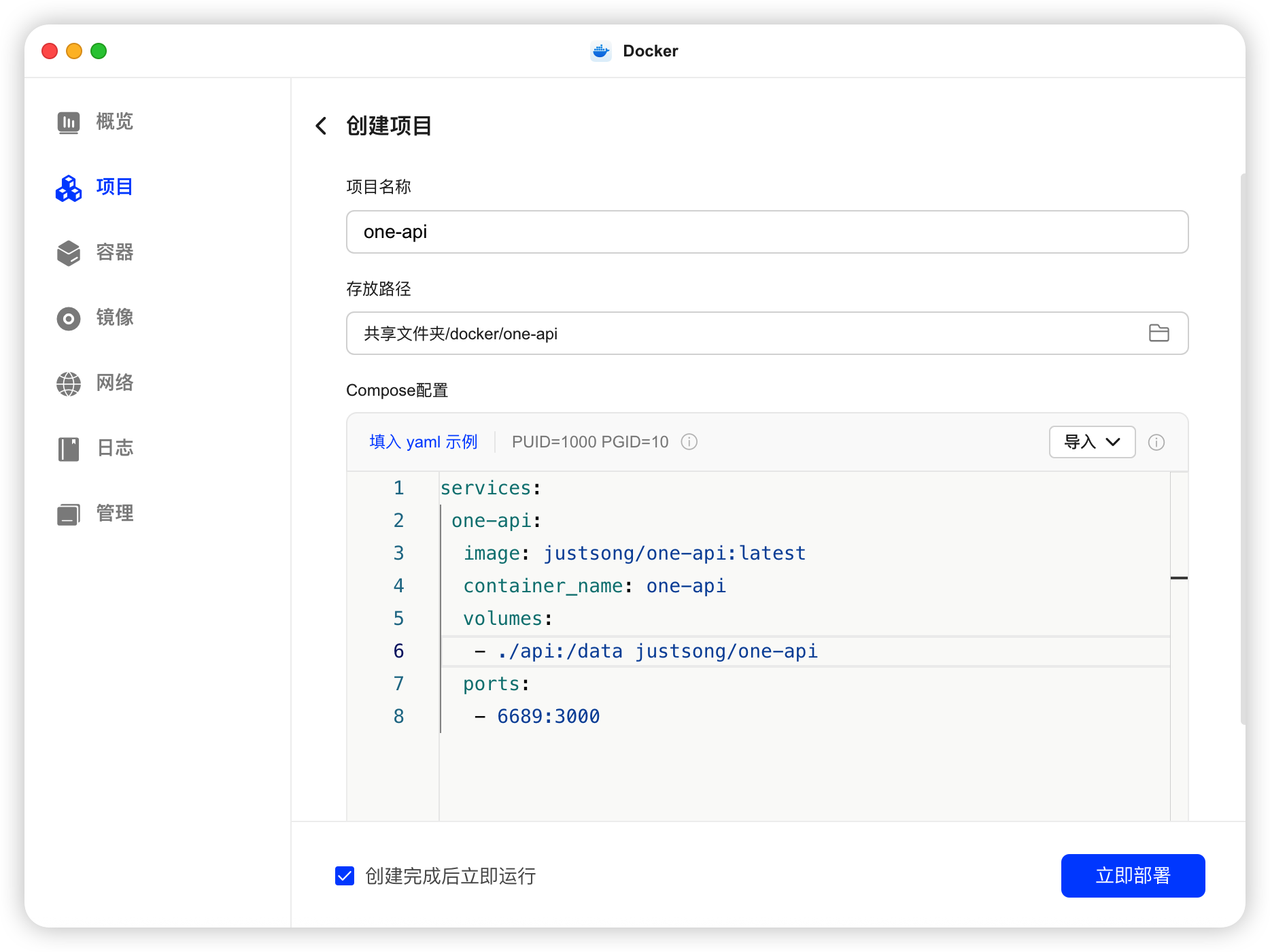 打开「Docker」应用,进入“项目”面板,新增项目: