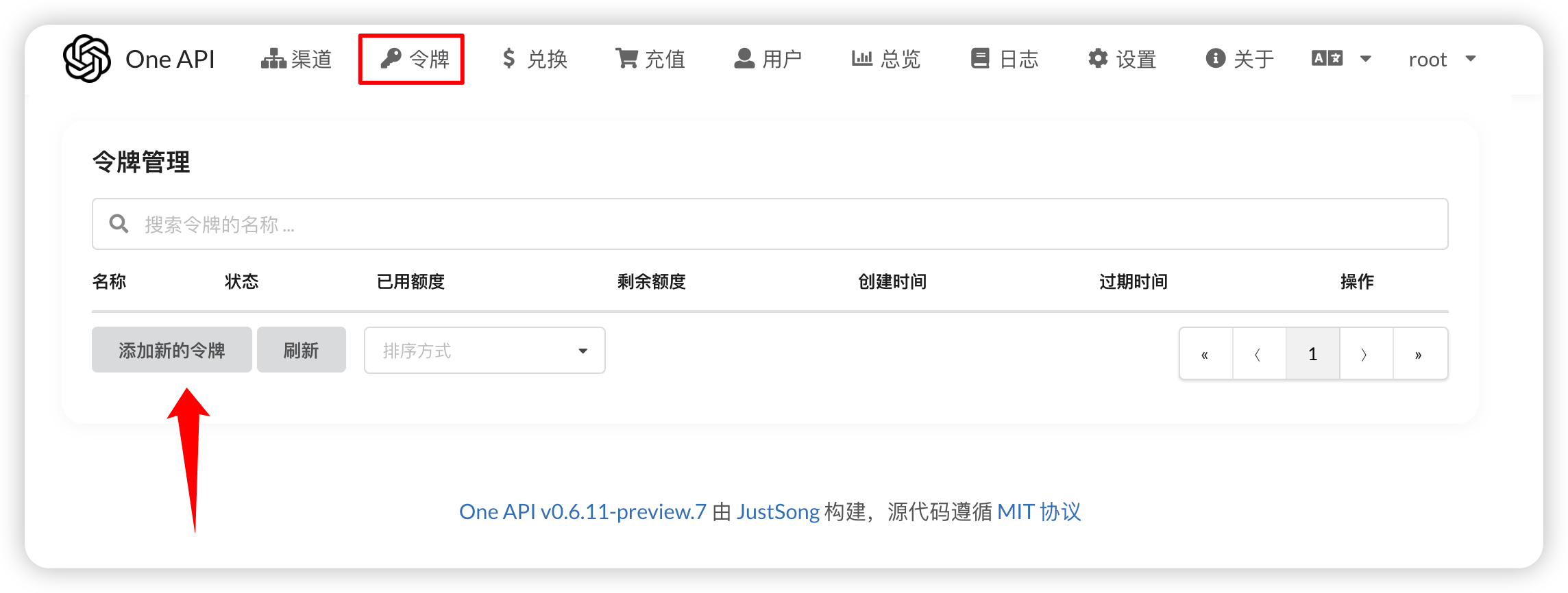 进入“令牌”页面,点击“添加新的令牌”。