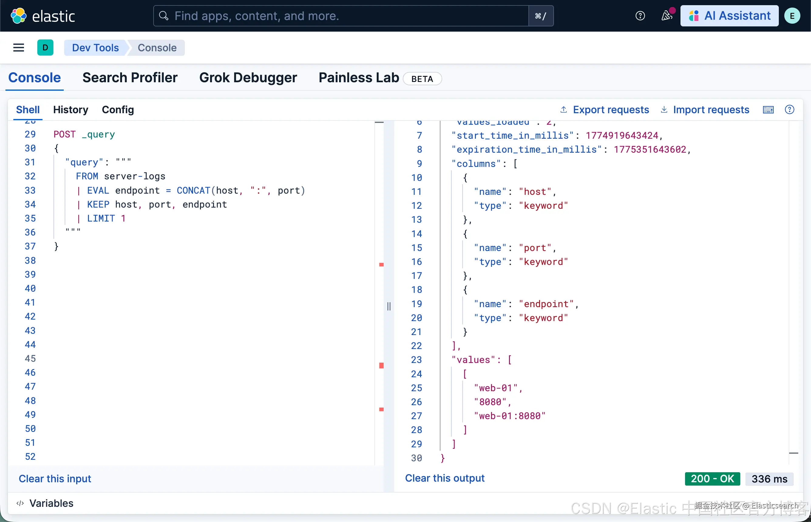 ES|QL 改变了这一局面。它拥有自己的执行引擎(不转换为 Query DSL),在节点间并发运行查询,并提供完整的字段计算工具集:EVAL、GROK、DISSECT、类型转换以及管道链式处理。