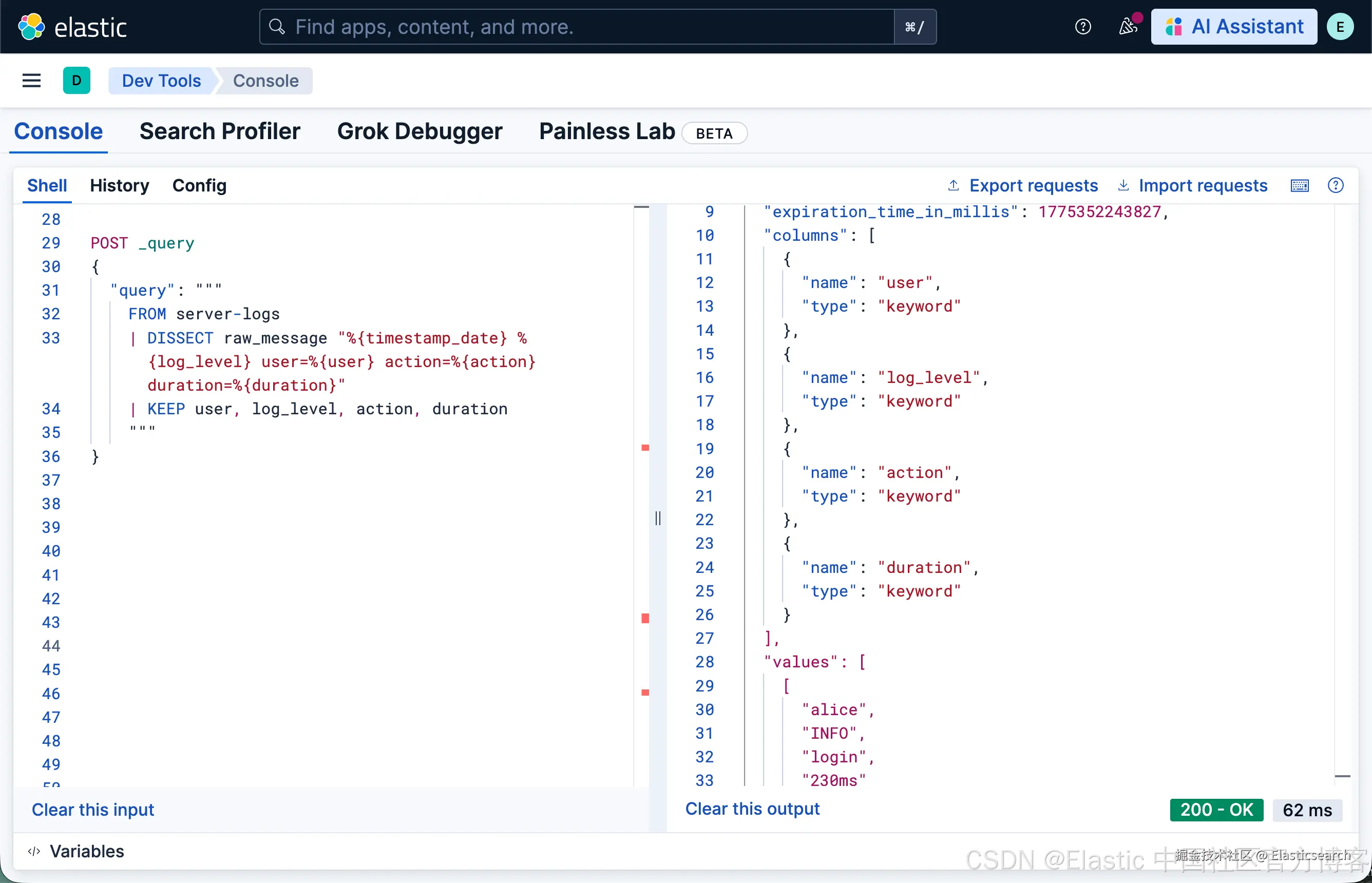 语法与 GROK 几乎相同,但 DISSECT 通过分隔符拆分数据,而不是匹配正则模式。这使得它在处理遵循一致格式的数据时更快。