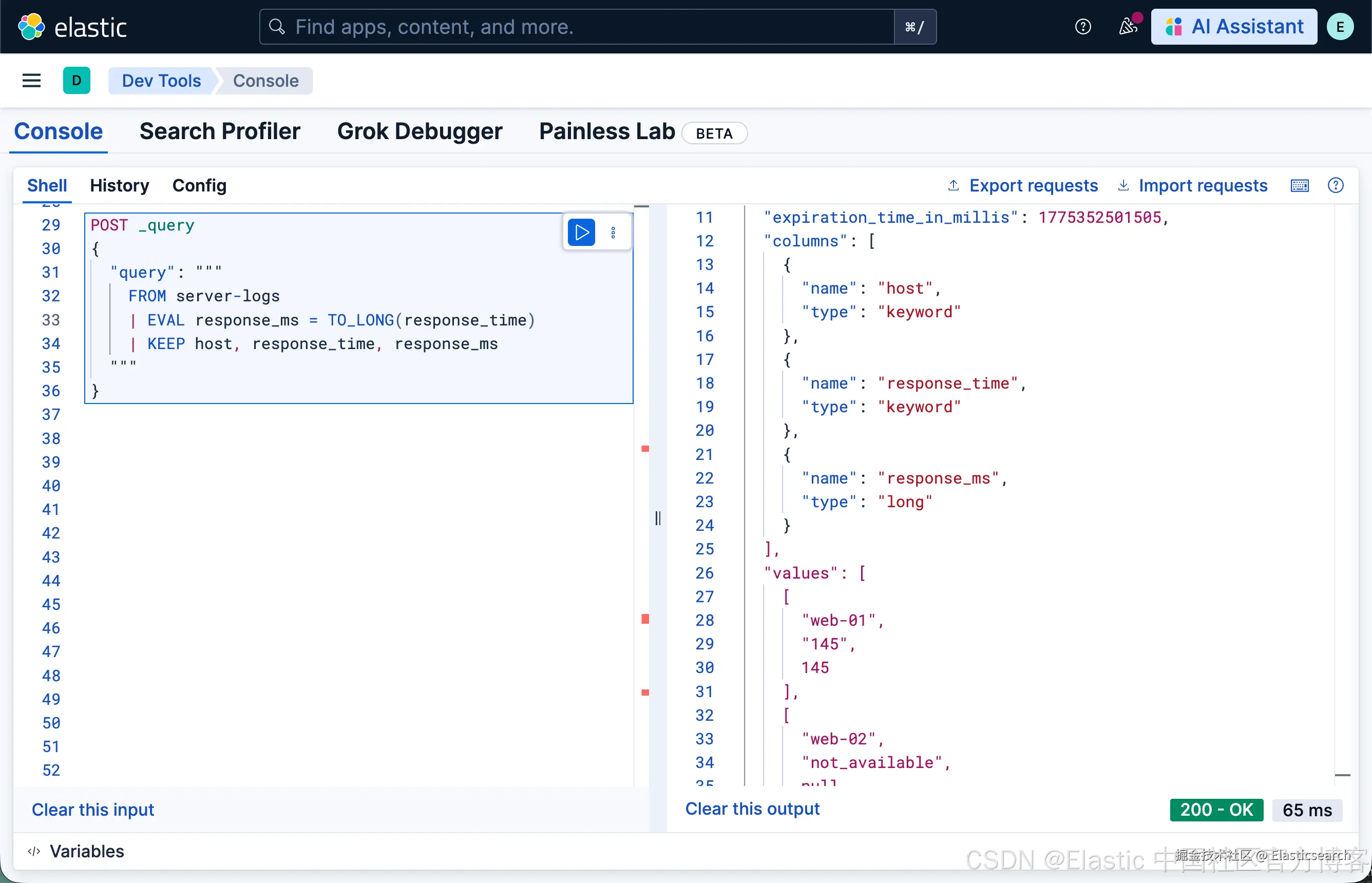 两者产生相同结果。与 Painless 的关键区别在于:转换失败会返回 null,而不是抛出异常。包含 "not_available" 的文档的 response_ms 字段将返回 null,ES|QL 会发出警告。