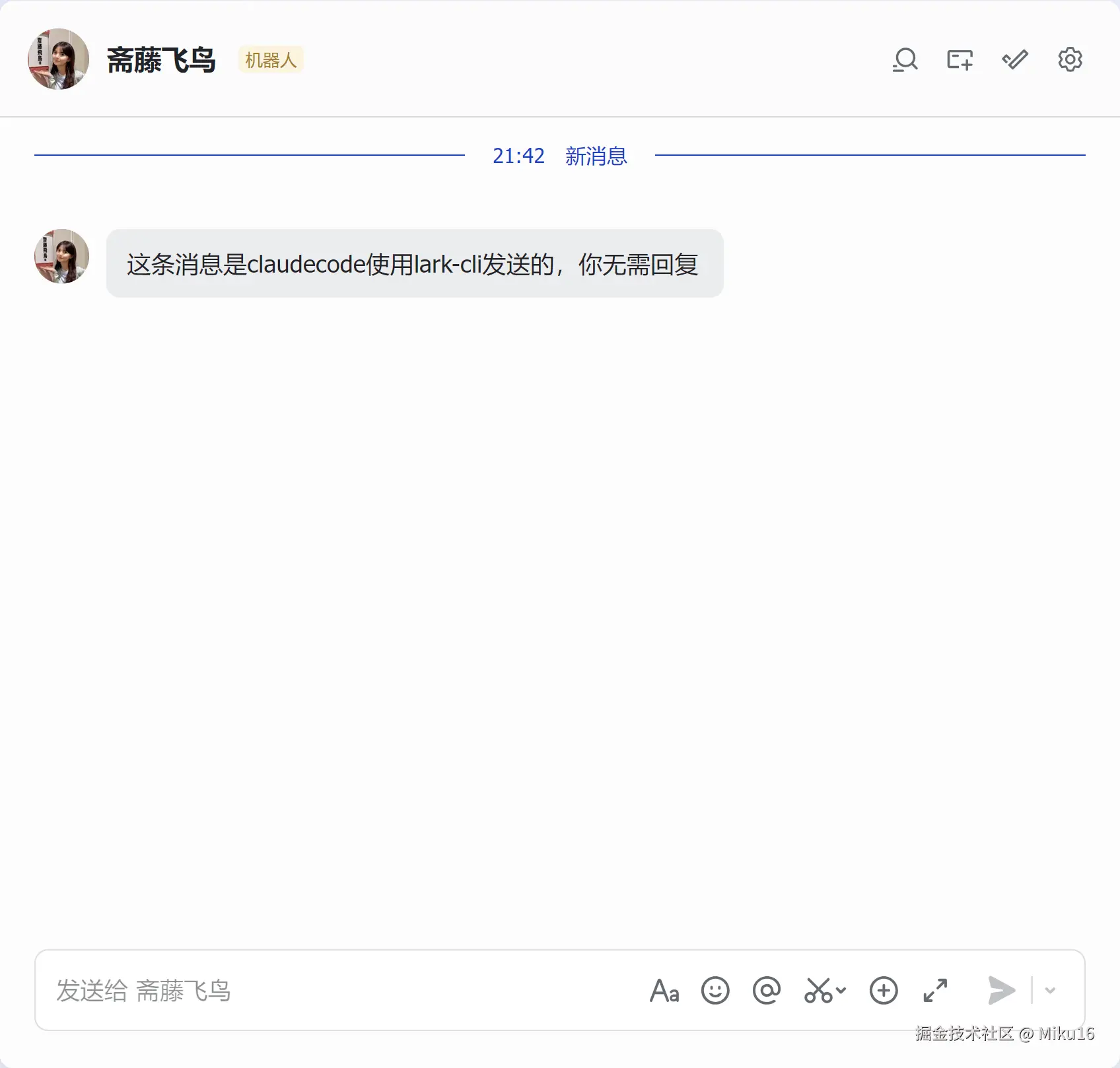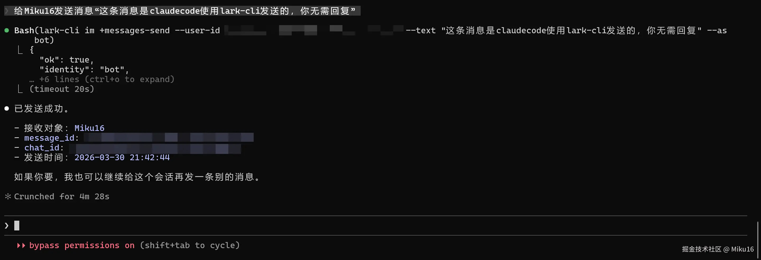 由于使用的个人飞书进行测试,所以lark-cli读取通讯录只能找到自己,读取不到外部联系人和机器人。如果是企业飞书的话,可以读取通讯录的联系人并发送消息。