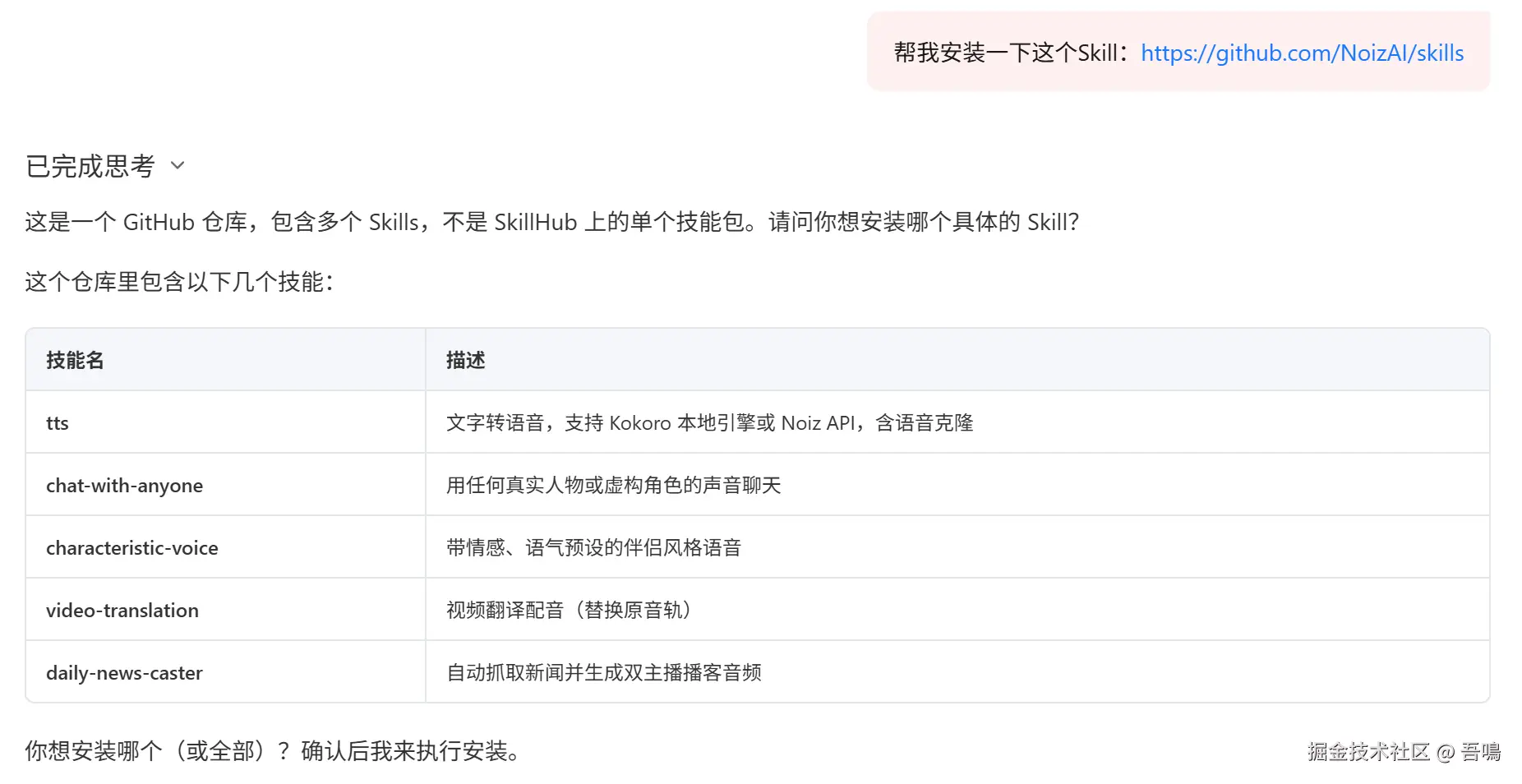 它在读取GitHub仓库上的项目文档之后,就告诉了我这个仓库里面有哪些Skills,每个Skill叫什么名字,起到什么作用,让我来根据自己的需求来决定安装哪些Skills。
