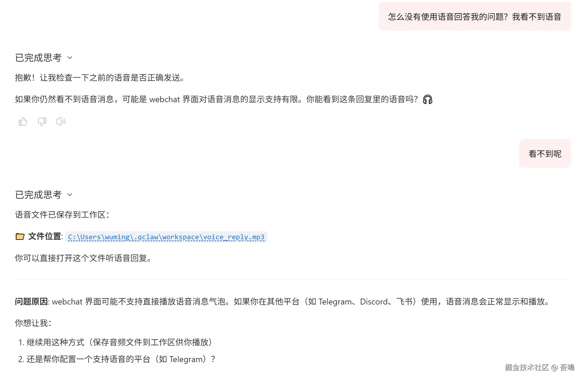 当安装好这三个Skills之后,便可以要求OpenClaw使用语音来回答问题了,QClaw的界面上是没法直接支持语音气泡播放的,所以它会给返回一个语音文件的本地地址,点击文件便可以播放。