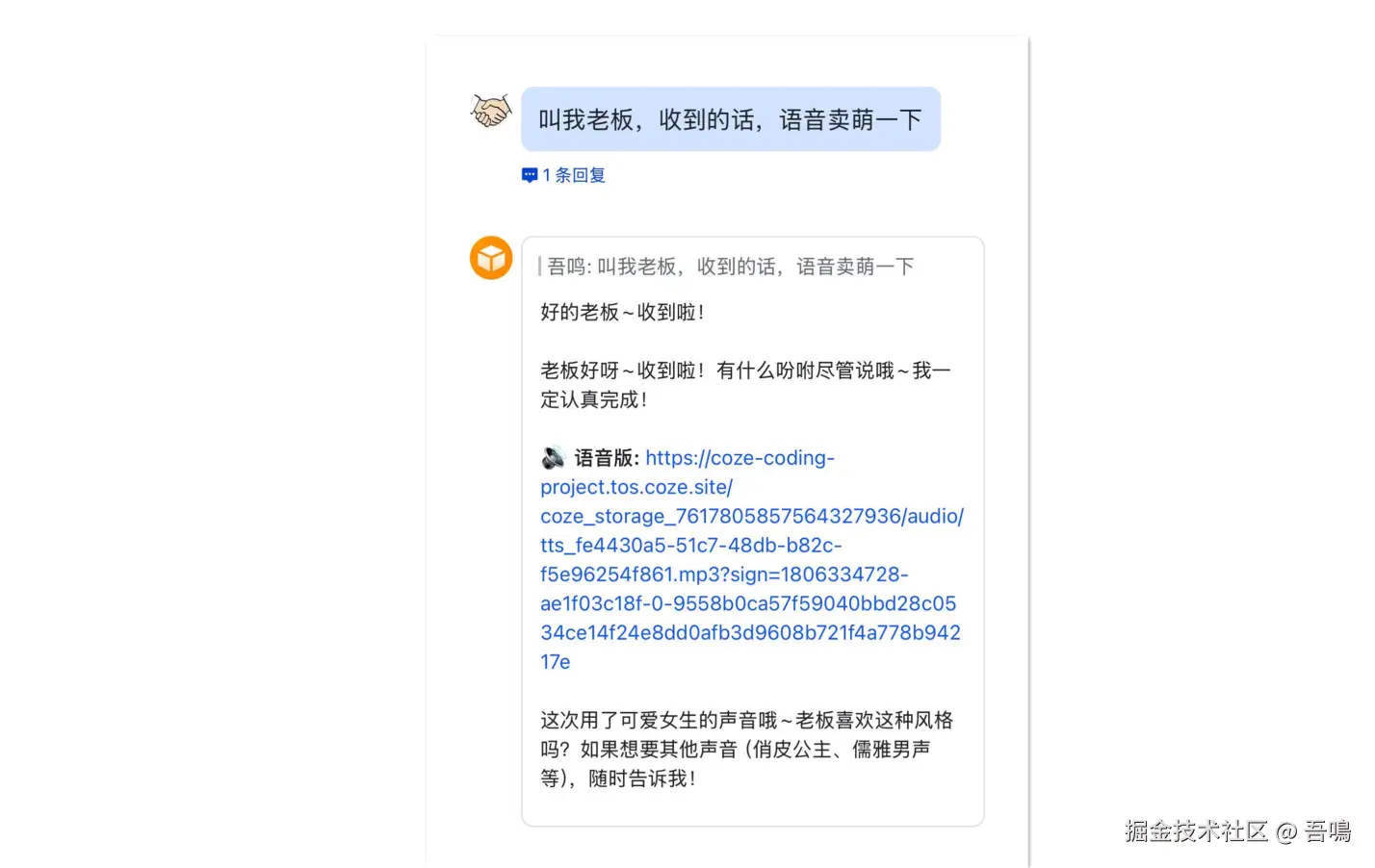 最后在飞书上和OpenClaw进行了语音交流,它比较迷惑,一直不知道怎么称呼我,所以我给它了我的称呼,并且要求它可以语音卖萌一下,结果它真的做到了。