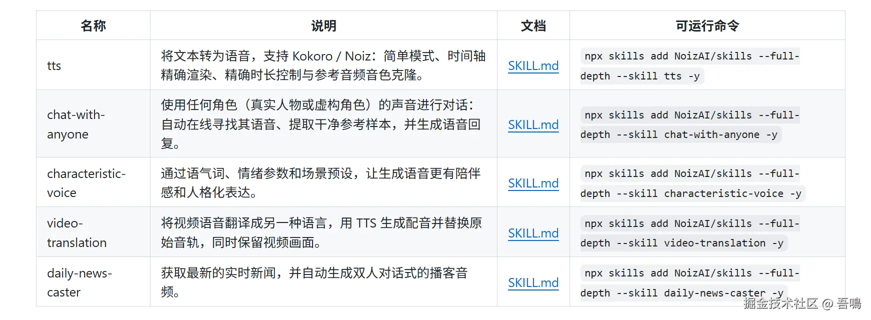 这个GitHub的项目包含了5个非常实用的Skills,分别是可以实现文字转语音、使用任何角色(真实人物或者虚构角色)的声音进行对话、语音加上情绪、视频语音翻译和新闻播客。