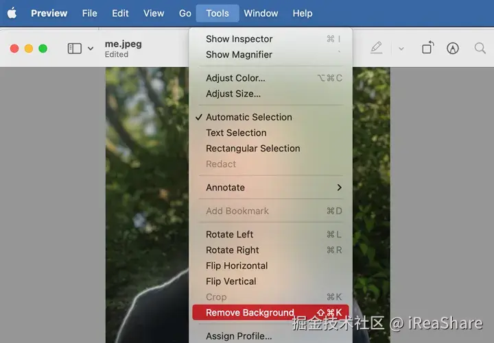在Mac电脑上用 “预览” 打开图片。点击“工具”图标(笔尖),然后选择“移除背景”选项。