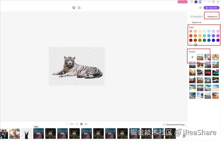 背景移除器是一款专为批量处理而设计的AI背景移除工具。您可以一键移除照片背景,并将背景替换为您所需的颜色和模板。此外,它还支持大多数图像格式,例如PNG、JPG、JPEG、BMP、TIFF等。