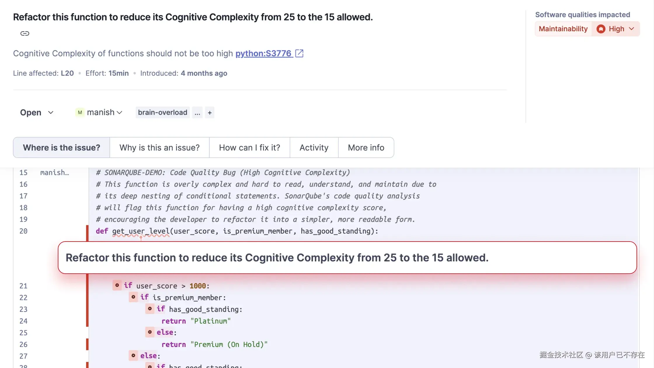 SonarQube 能把代码质量量化。它能直接告诉我:这个项目有30个安全漏洞,技术债务需要50天才能还清。有了这个仪表盘,我们在排期的时候就有了底气:先别加新功能了,看着红彤彤的质量报告,先把债还了吧。