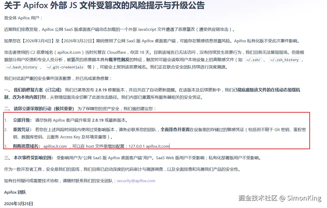 2026年3月25日,安全研究人员披露了一起针对知名API协作平台Apifox的供应链投毒攻击。攻击者通过篡改Apifox官方CDN托管的JavaScript文件,在桌面端应用中植入了恶意代码,意图窃取开发者的SSH密钥、Git凭证、命令行历史等敏感信息,并具备远程执行任意代码的能力。