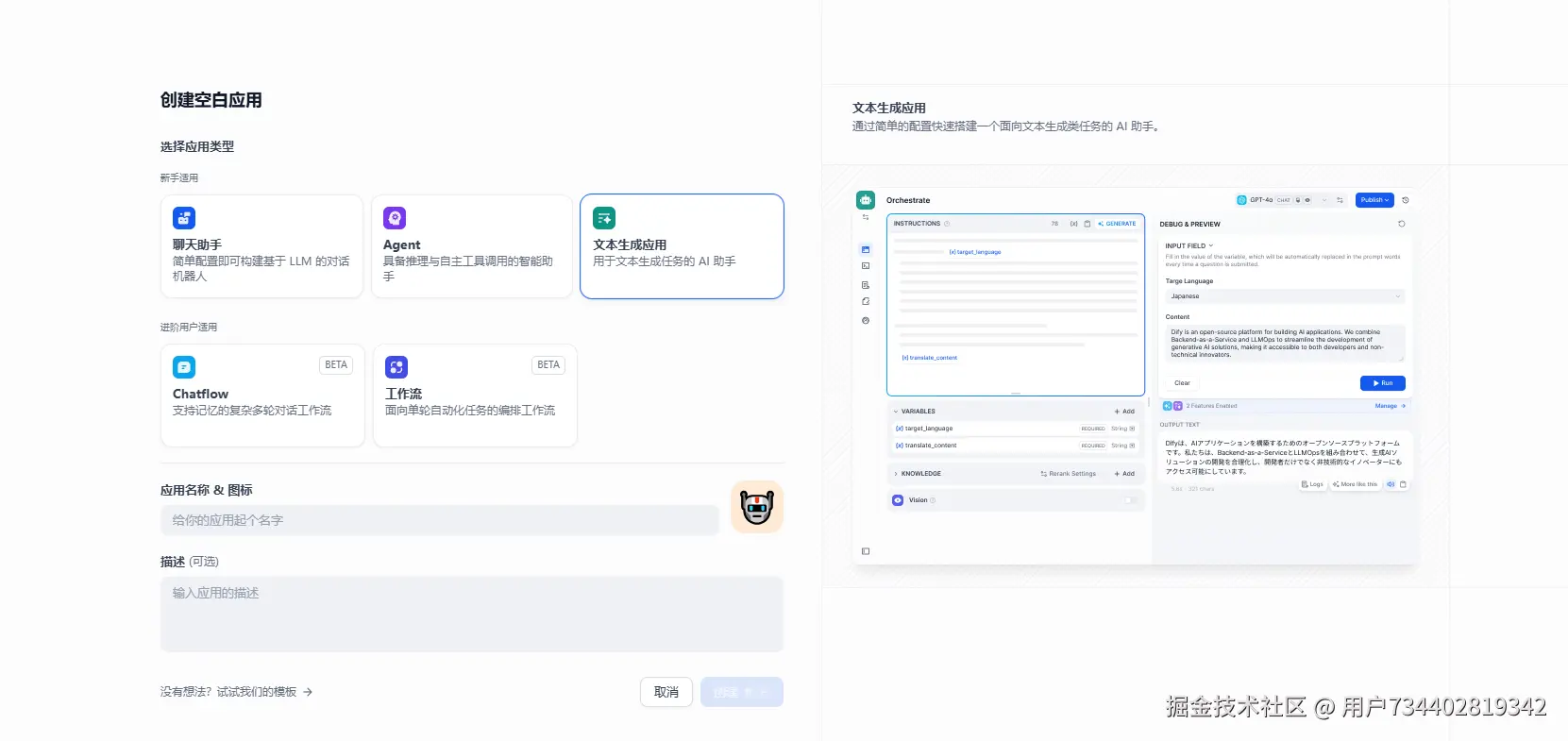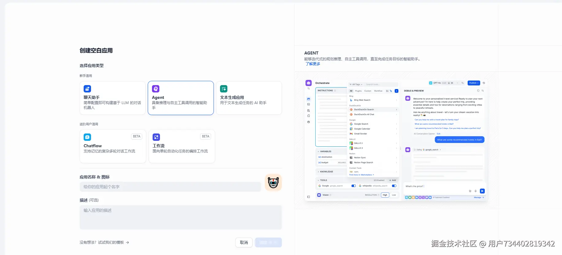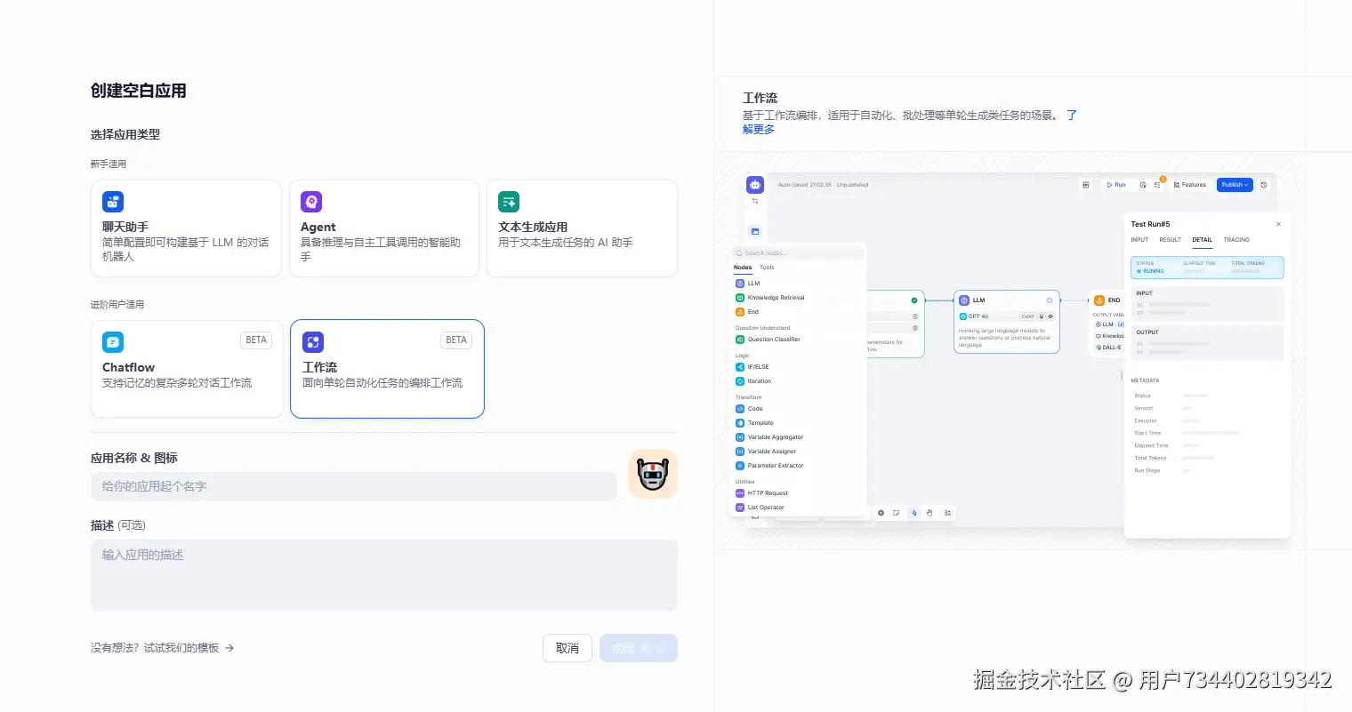 创建空白应用 : 聊天助手 / Agent / 文本生成应用 / ChatFlow / 工作流