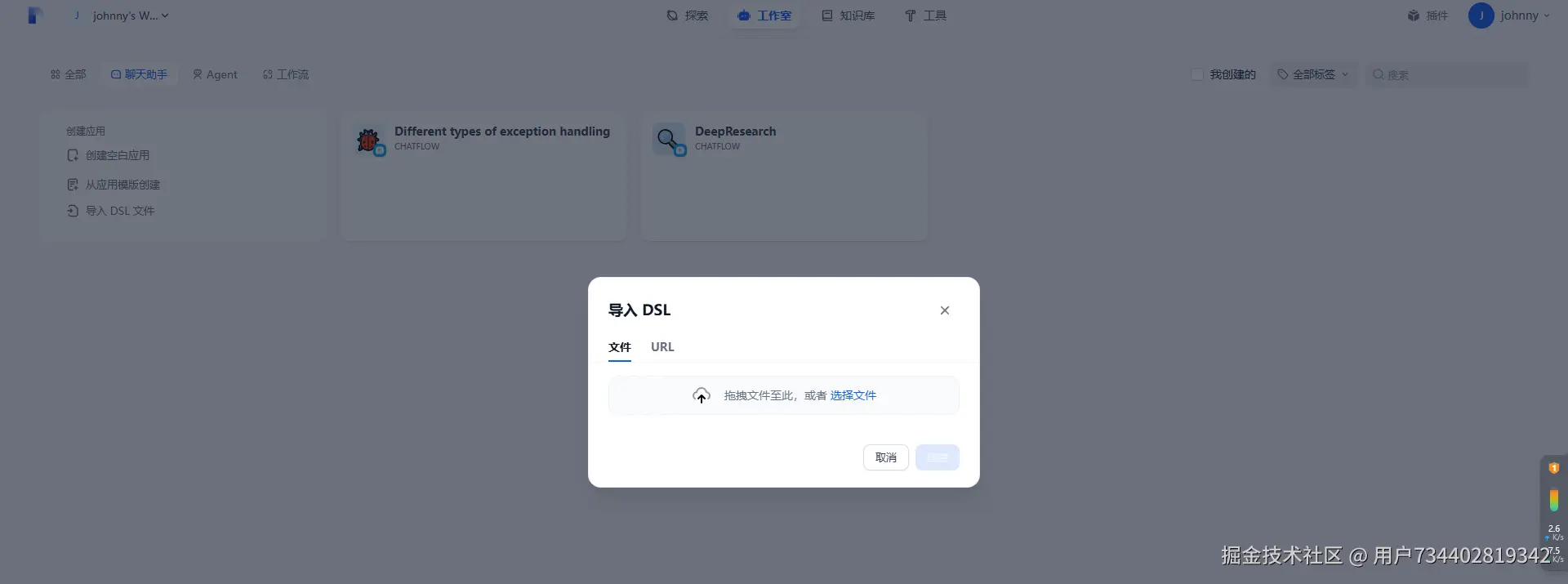 将 DSL 文件上传至 Dify 平台内即可完成 Dify 应用的导入。