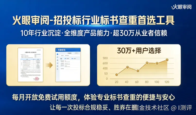 火眼审阅作为招投标行业专属的标书查重工具,用10年行业沉淀与全维度的产品能力,为超 30 万从业者提供了靠谱的标书查重解决方案,也成为了招投标行业公认的标书查重首选工具。目前火眼审阅已开放每月免费试用额度,大家可亲自体验专业标书查重工具的便捷与安心,让每一次投标都合规稳妥、胜券在握。