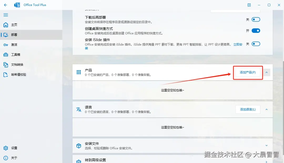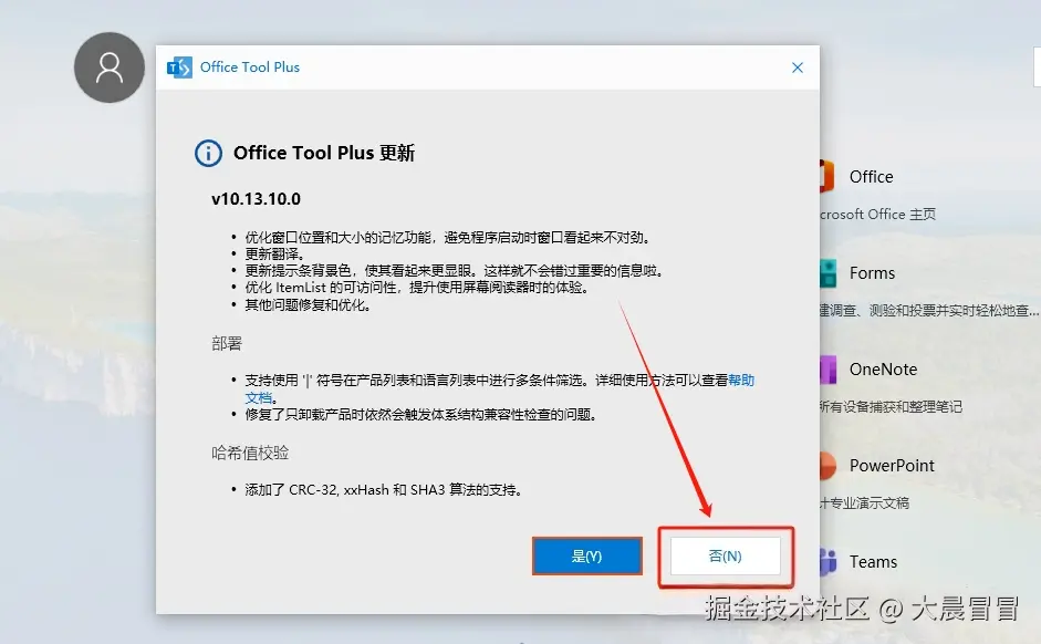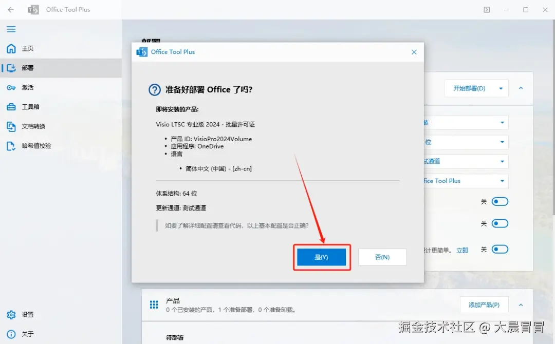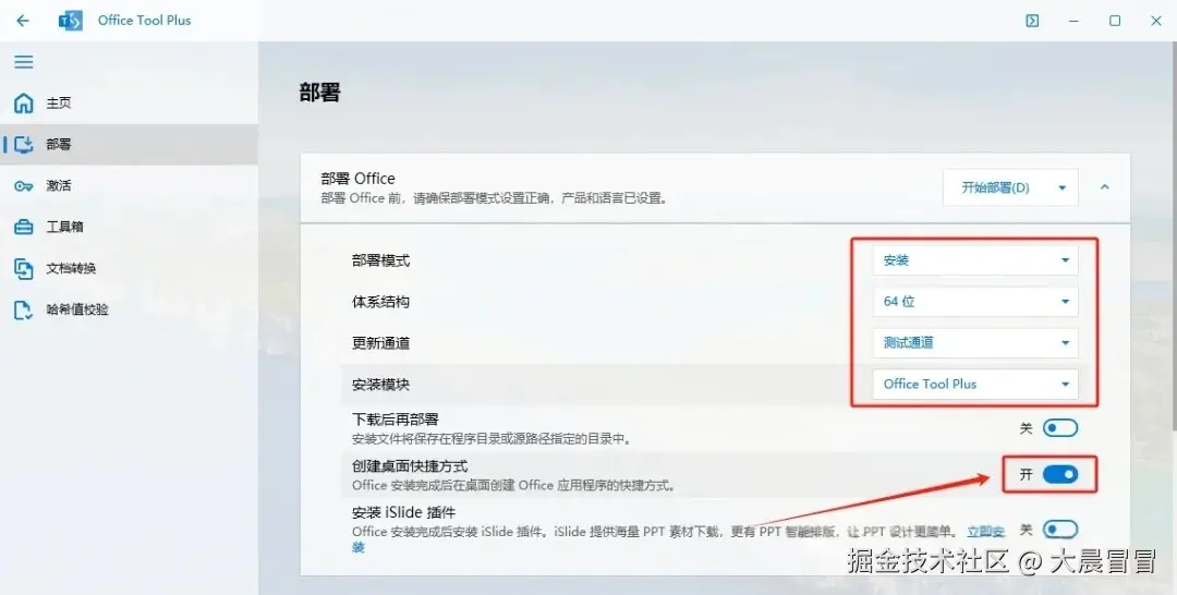 9.选择【64位】,接着选择【测试通道】和【Office Tool Plus】,最后【创建桌面快捷键】选择开启。