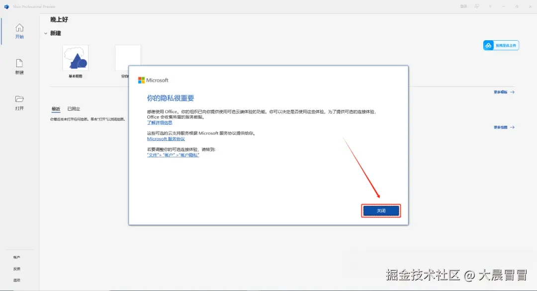 21.在桌面上打开Visio软件,点击【接受】。点击关闭。