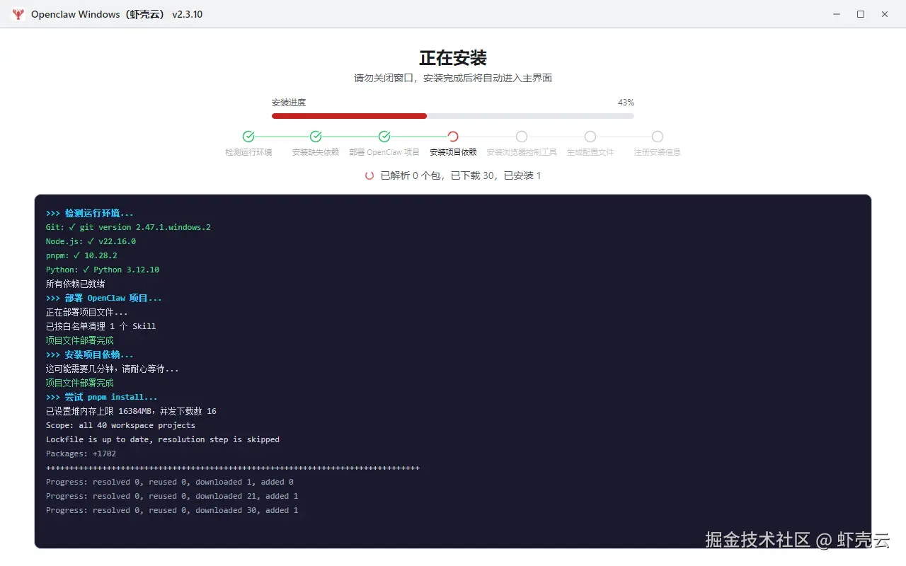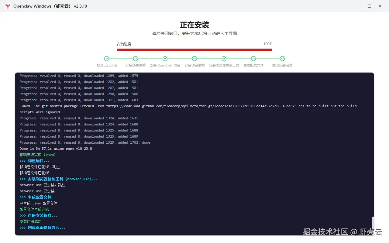 3.等待自动部署完成:点击安装后,程序将自动完成全流程部署,全程约 3-5 分钟,具体时长取决于电脑配置,部署过程中请勿关闭安装窗口,否则会导致部署中断,需重新进行安装。自动部署包含以下内容:检测电脑运行环境并补充缺失依赖、部署 OpenClaw 核心项目文件、安装浏览器控制工具(用于自动化操作)、生成适配 Windows 系统的配置文件、注册安装信息并创建桌面快捷方式。