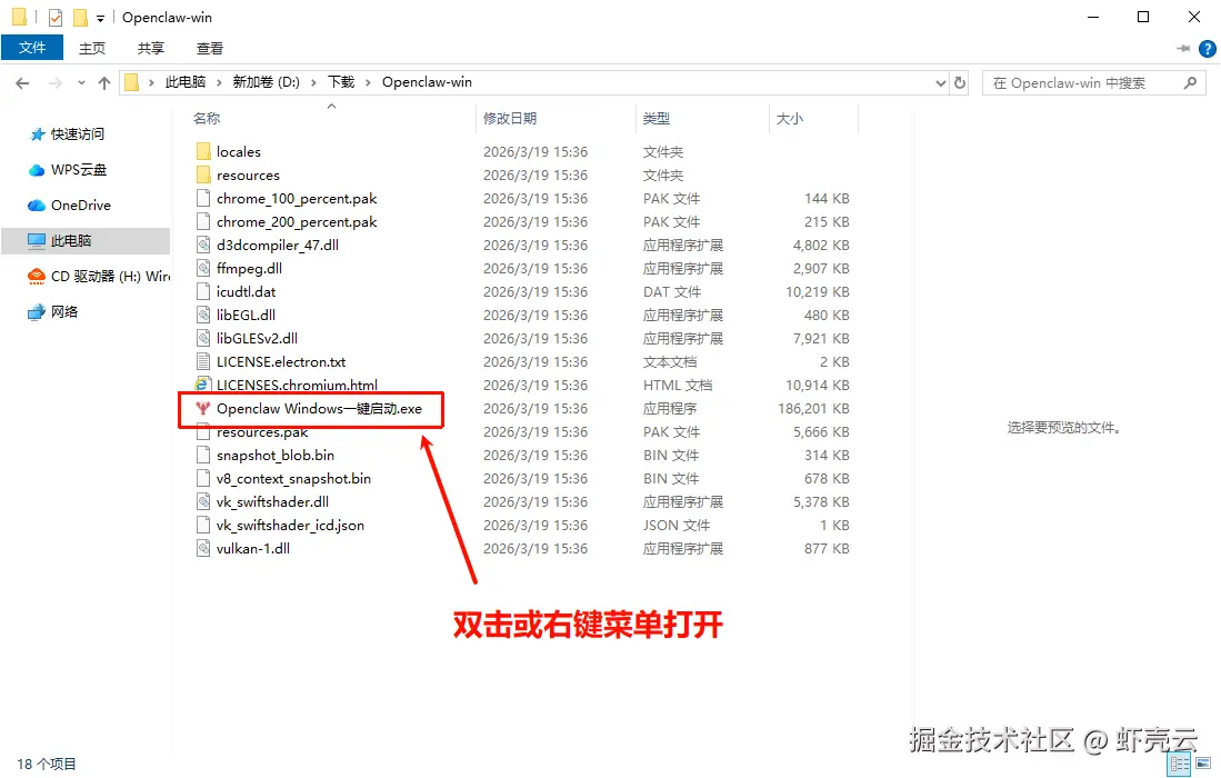 - 进入解压目录:打开解压后的 Openclaw-win 文件夹,找到图标为红色龙虾的 Openclaw Windows 一键启动.exe 程序,该程序为部署核心入口,辨识度较高。