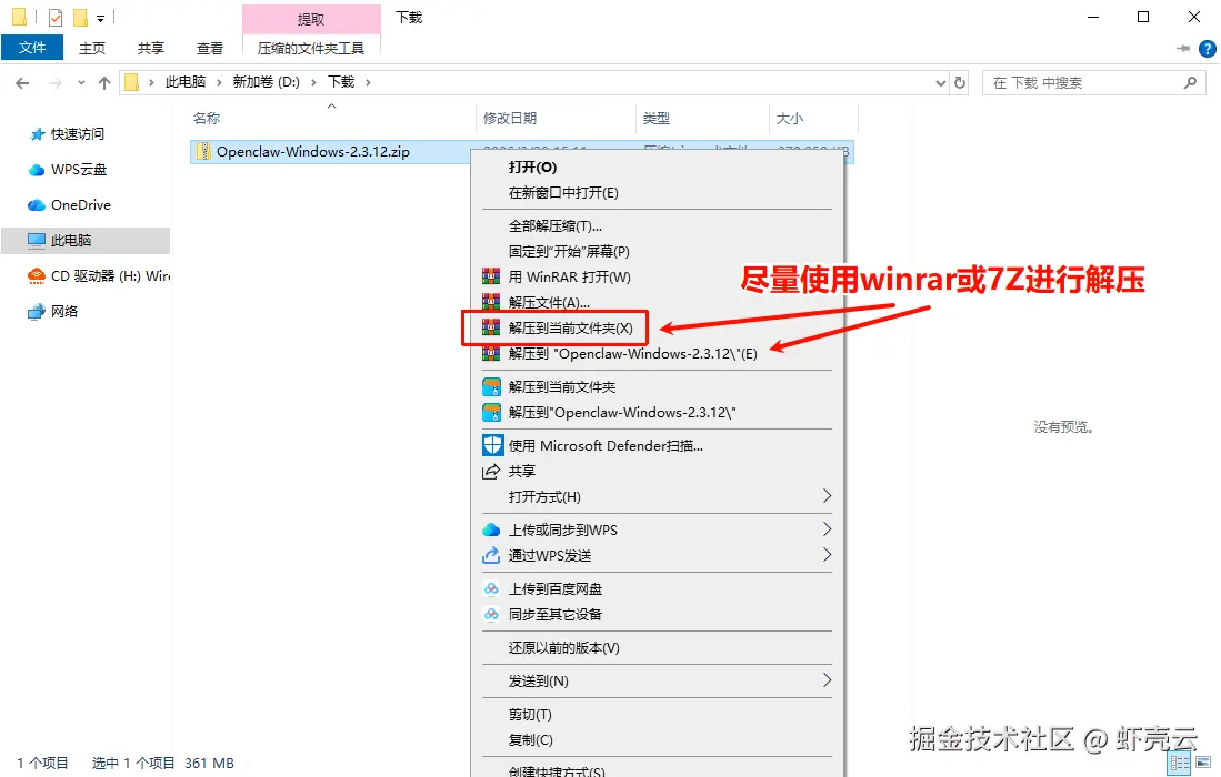 - 解压文件:不建议使用 Windows 系统自带的解压工具,易出现文件损坏问题,推荐使用 WinRAR 或 7-Zip(两款均为免费工具,可直接在网上下载)。找到下载完成的 Openclaw-Windows-2.4.1.zip 压缩包,右键点击后选择「解压到当前文件夹」或「解压到 "Openclaw-Windows-2.4.1"」,等待 1-2 分钟,解压完成后将生成包含所有部署文件的 Openclaw-win 文件夹。