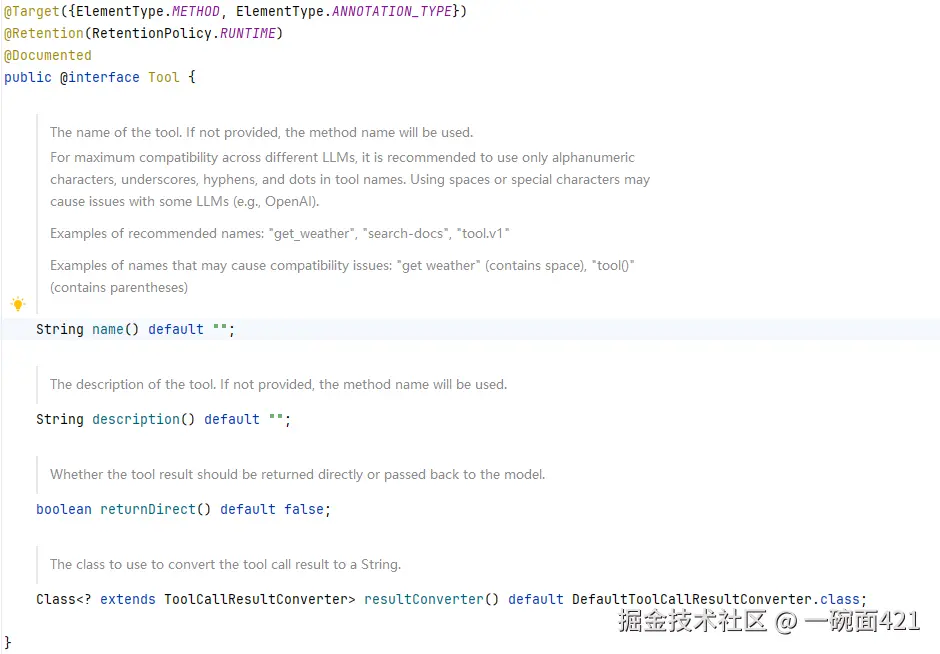 在 Spring AI 中,我们可以通过在方法上添加 @Tool 注解,将一个普通方法转换为可被模型调用的工具。