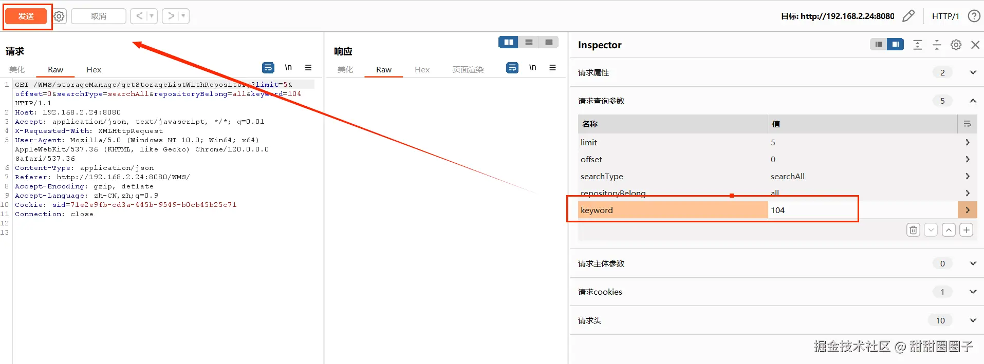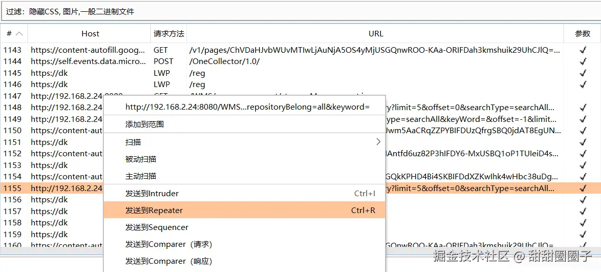 选择一条请求右键点击发送到Repeater;在Repeater中可进行请求数据的修改,修改后重新发送请求。