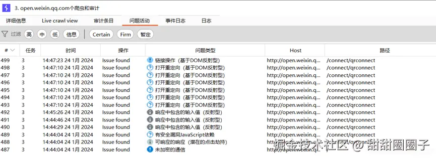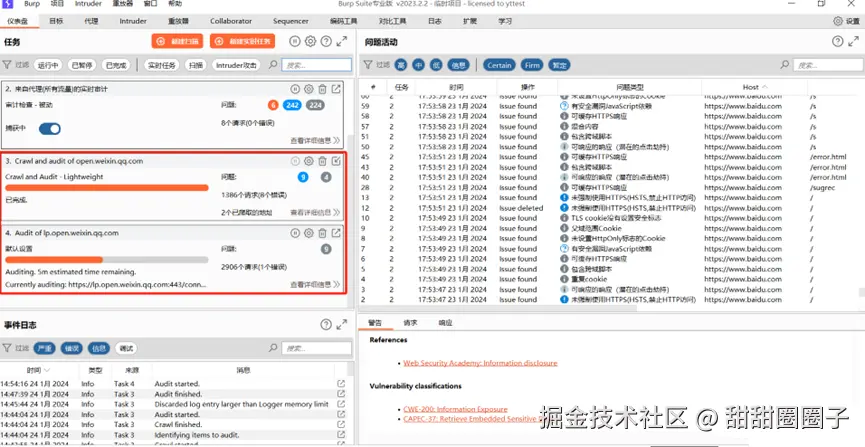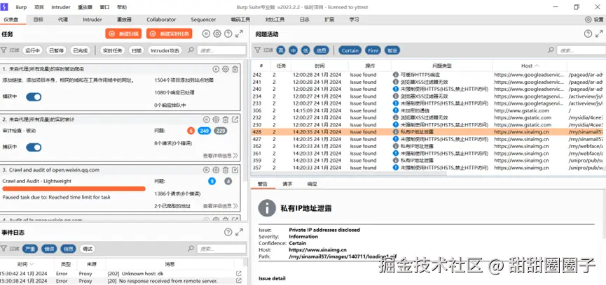 仪表盘是burp suite首页面,包含扫描任务、时间日志、问题活动等信息,左侧显示的内容是对代理拦截的全部请求默认进行扫描,扫描概况,右侧显示为扫描具体问题。