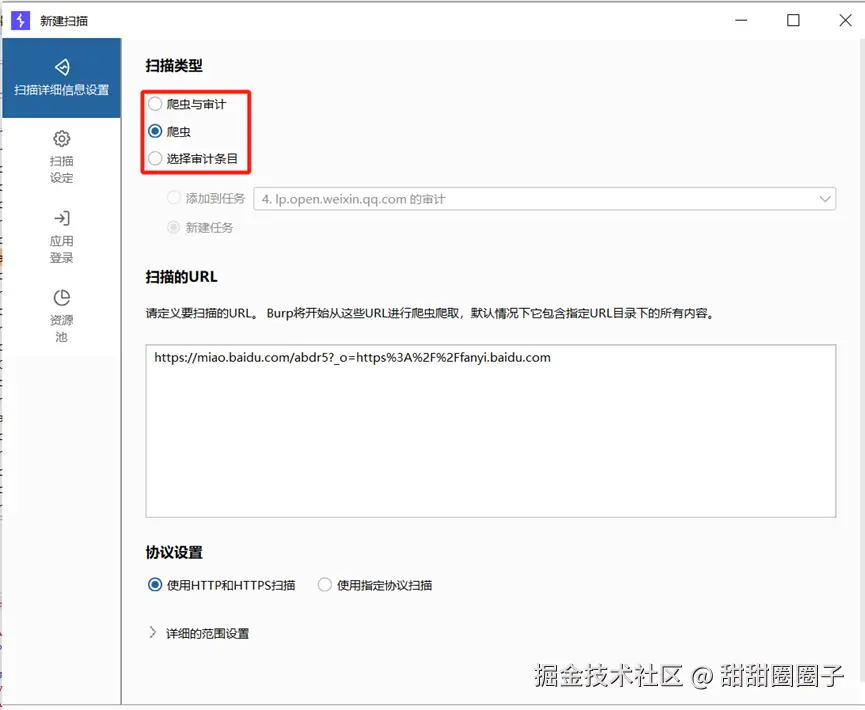 多接口扫描:通过创建扫描任务,选择扫描类型,爬虫与审计或爬虫,选择审计条目选项添加多个请求进行扫描;