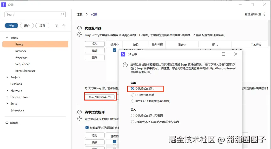 代理设置:代理设置中可以导入导出证书,在其他浏览器测试web系统时,想要抓包拦截需设置代理并安装证书。按下图步骤导出证书后,在浏览器中安装。