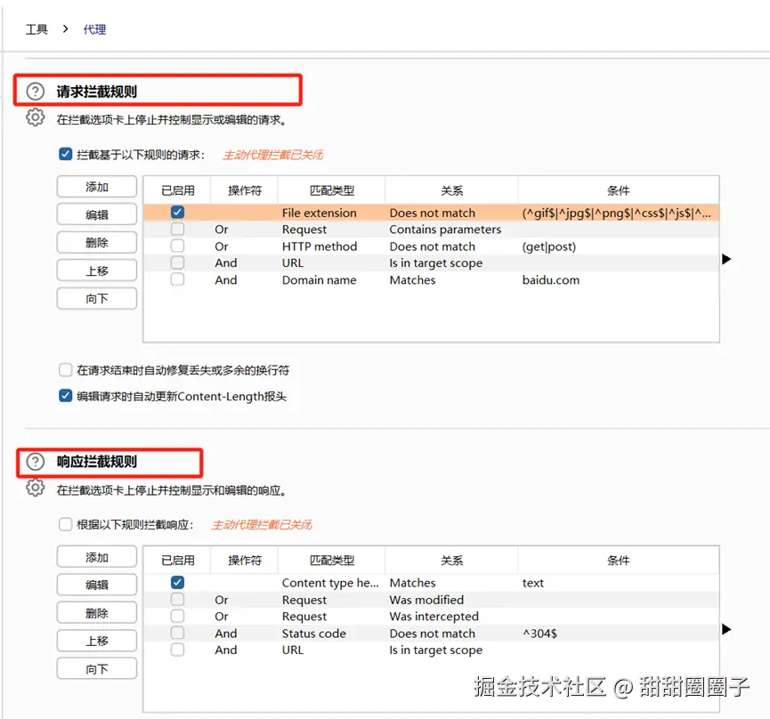 拦截规则:分为请求拦截和响应拦截,可设置不同规则,域名,IP地址、url、参数名、参数值、cookie名、cookie值等。