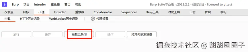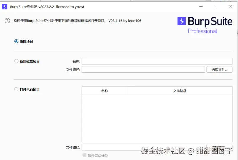 打开burp suite,可选择临时项目,关闭软件后,不会保存记录,也可选择创建项目或已有项目,关闭软件后,后续可再次查看。