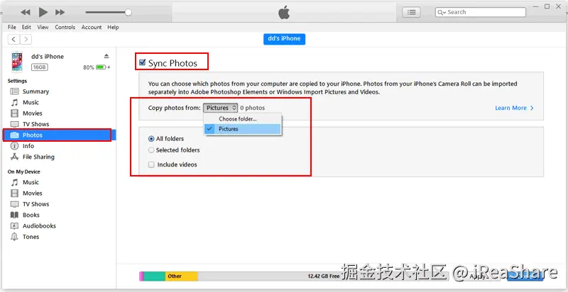 - 点击「照片」选项卡,找到「同步照片」选项并勾选,接着选择「选定的文件夹」,再挑选需要传输的实况照片。