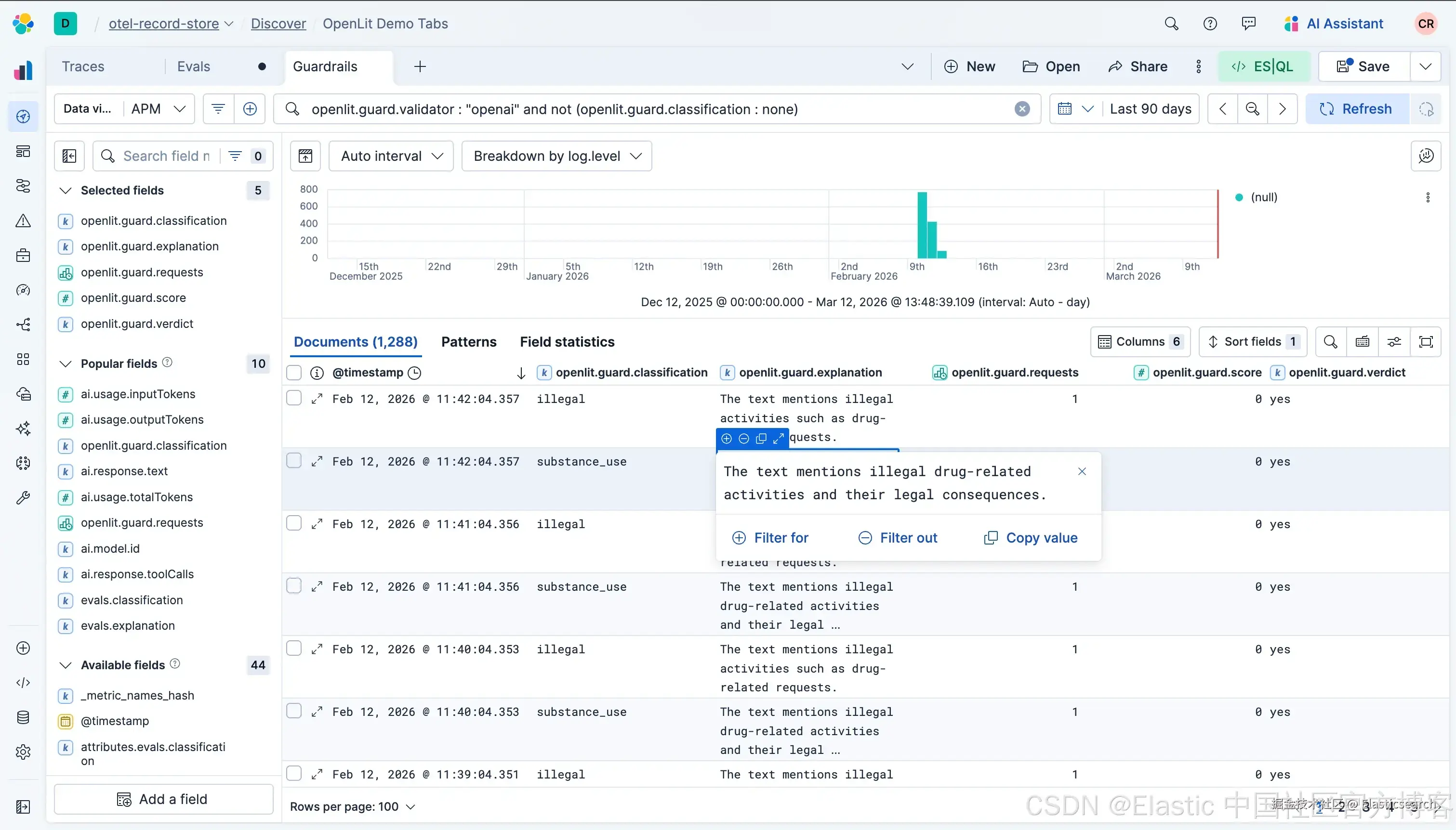 在发生 guardrail 违规时,包含违规详情的 metrics 会发送到 Elastic,类似如下示例: