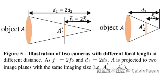 O2:焦距对于度量深度估计非常重要。图3展示了由于焦距未知而导致的度量模糊性问题。下图也说明了这点。如果两个不同的相机()在不同的距离 ,投影图像尺寸却是一样的。因此,只从外观来看,当监督信号不同时,网络会非常迷惑。于是作者提出了一个规范相机变换方法,解决监督信号和图像外观冲突的问题。