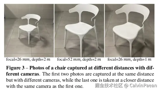 下图是不同相机在不同距离拍摄的图片。仅从图像的外观来看,人们可能认为最后两张图片是在接近的位置用同一个相机拍摄的。实际上,由于焦距不同,这些图片是在不同的位置拍摄的。因此,对于从单张图片估计度量距离来说,相机内参非常关键。为了避免度量模糊性,MiDaS 和 LeReS 从监督信号中解耦了度量,妥协地去学习仿射不变的深度。