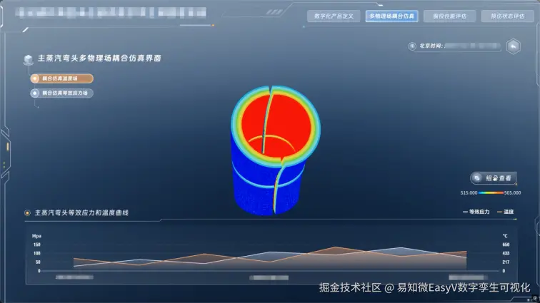 为全面应对该科研机构面临的设备安全与寿命管理挑战,易知微围绕承压设备安全评估与寿命管理需求,协助该国家级技术科研机构打造了承压部件的数字孪生仿真模型。以主蒸汽管道及弯头为核心对象,实现对结构形态、运行状态与评估结果的统一承载,持续同步温度、压力等核心工况指标,将仿真计算结果动态映射至三维模型,实现物理设备向虚拟空间的精准复现。支持针对关键部位进行区域级拆解分析,动态评估多物理场分布、材料性能变化及损伤累积过程,自动识别高风险区域并呈现演化趋势,为设备安全评估、技术论证与监管决策提供连续、直观的数字化支撑。