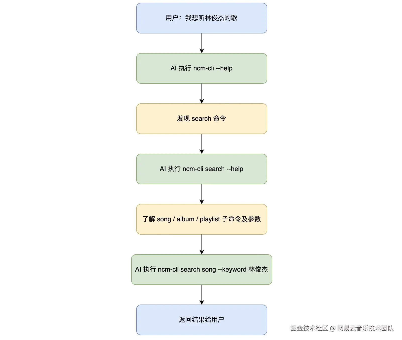 AI 拿到任务后,会先执行ncm-cli --help看顶层有什么,再根据需要钻进具体子命令查参数,最后再执行。整个过程和人第一次用一个新 CLI 工具的探索方式完全一样。