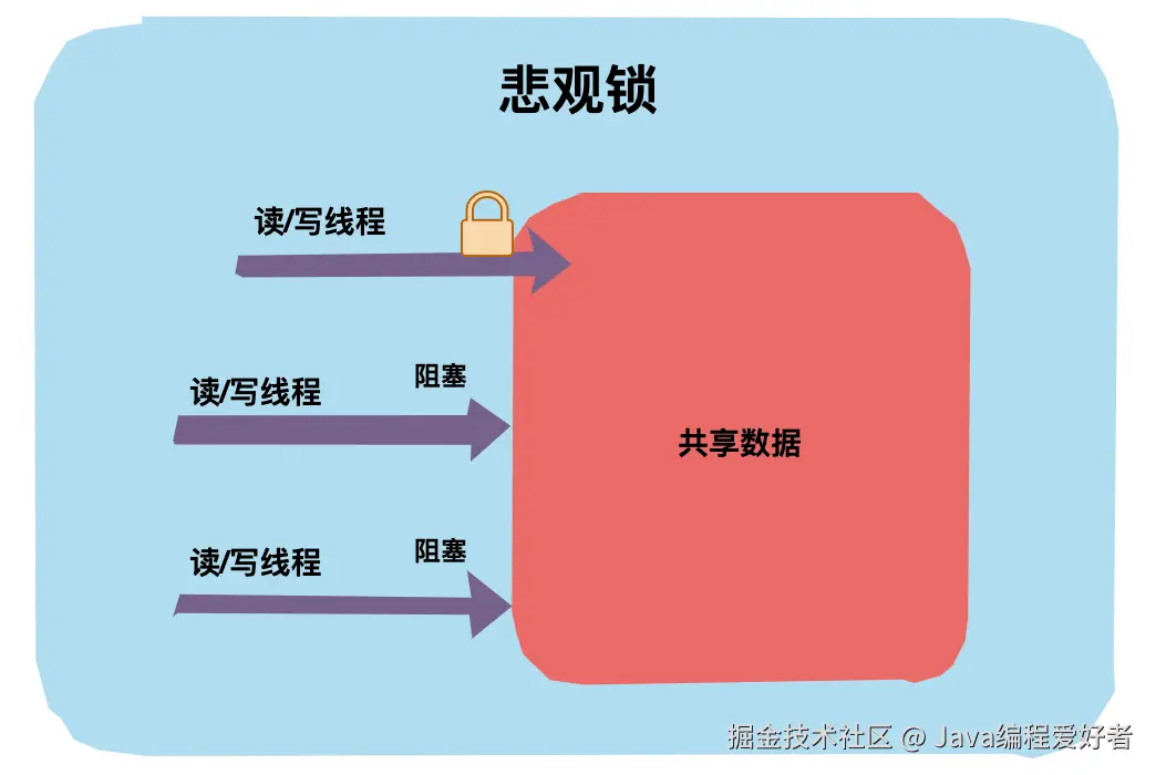 回到代码世界中,一个共享数据加了悲观锁,那线程每次想操作这个数据前都会假设其他线程也可能会操作这个数据,所以每次操作前都会上锁,这样其他线程想操作这个数据拿不到锁只能阻塞了。
