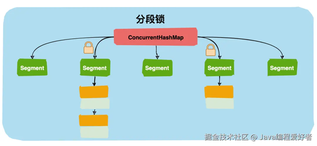 分段锁设计目的是将锁的粒度进一步细化,当操作不需要更新整个数组的时候,就仅仅针对数组中的一项进行加锁操作。