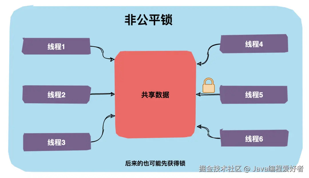 非公平锁是指多个线程获取锁的顺序并不是按照申请锁的顺序,有可能后申请的线程比先申请的线程优先获取锁,在高并发环境下,有可能造成优先级翻转,或者饥饿的状态(某个线程一直得不到锁)。