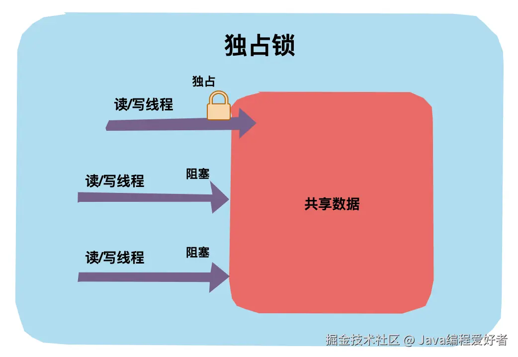 独占锁是指锁一次只能被一个线程所持有。如果一个线程对数据加上排他锁后,那么其他线程不能再对该数据加任何类型的锁。获得独占锁的线程即能读数据又能修改数据。