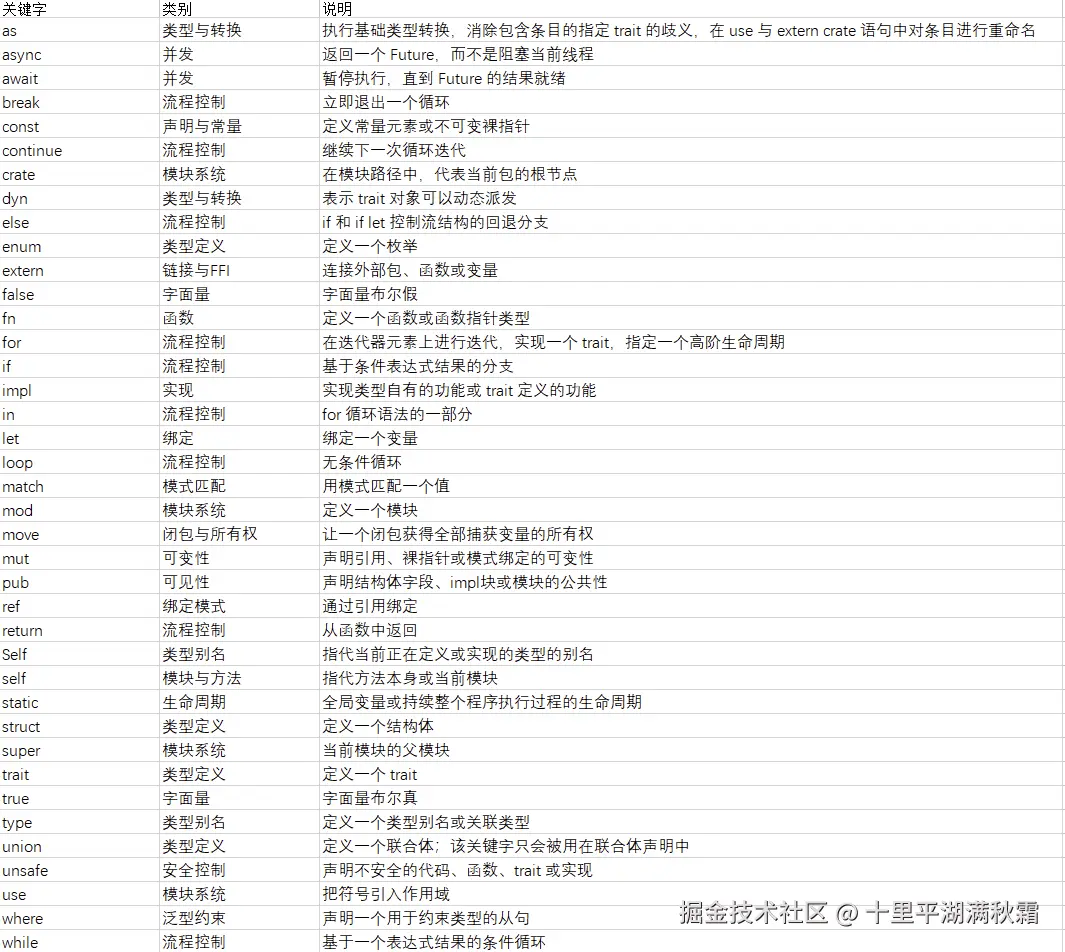 关键字与其他编程语言类似,Rust 也拥有一系列只能被用于语言本身的保留关键字。要记住,你不能使用这些关键字来命名自定义的变量或函数。大部分关键字都有特殊的含义,你会使用它们来完成 Rust 程序中各式各样的任务;还有一些关键字目前没有任何功能,但它们被预留给了未来可能会添加的功能。