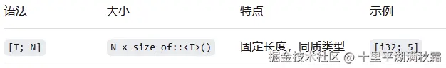 数组中的每一个元素都必须具有相同的类型。Rust 中的数组拥有固定的长度,一旦声明就再也不能随意更改大小,这与其他某些语言有所不同。