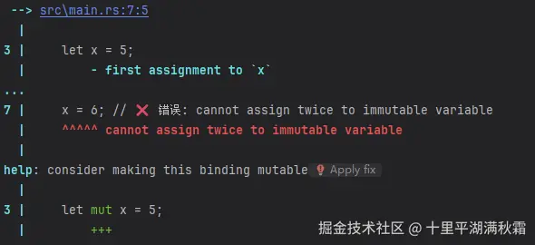 x = 6; // ❌ 错误: cannot assign twice to immutable variable