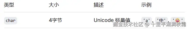 注意:char的字面量使用单引号指定,而不同于字符串使用双引号指定。